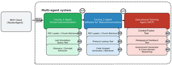 Despite these grounding advancements, robust RAG tutor deployment at scale is hampered by two persistent system-level issues. First, the lack of standardized interaction patterns results in ad hoc compositions that are challenging to extend, audit, or reuse. Realistic tutoring systems usually require a combination of specialized components, including document retrievers, candidate re-rankers, prompt construction modules, pedagogical policy engines, and generation agents. Thus, multi-agent orchestration models have been investigated recently, wherein decision, decomposition, router, and retrieval agents coordinate retrieval techniques, simultaneous searches across heterogeneous sources, and the merging or arbitrating of candidate responses [18,19,20,21]. It has been demonstrated that learning-based schedulers and hierarchical multi-agent designs can dynamically create workflows that balance accuracy per query, cost, and latency; these architectures allow for more precise control over failure modes and resource consumption and enhance QA accuracy on complex and multimodal benchmarks [22,23]. Protocol specifications similar to a Model Context Protocol (MCP) and an Agent Communication Protocol (ACP) are meant to provide the practical requirements for explicit message schemas, lifecycle semantics, and provenance reporting, as highlighted in surveys of emerging standards for agent interoperability [21]. Multi-agent orchestration can significantly lower hallucination rates and operational costs while improving the groundedness of responses under production constraints, as demonstrated by real-world agentic RAG deployments (such as in domain-specific advising and university admissions counseling) [22].