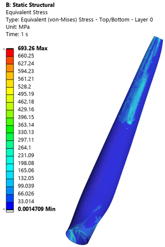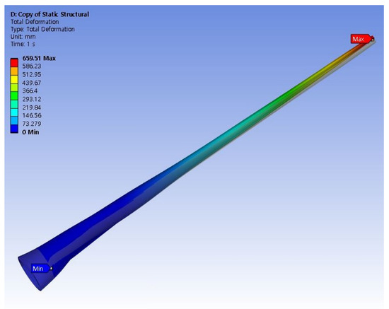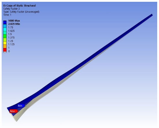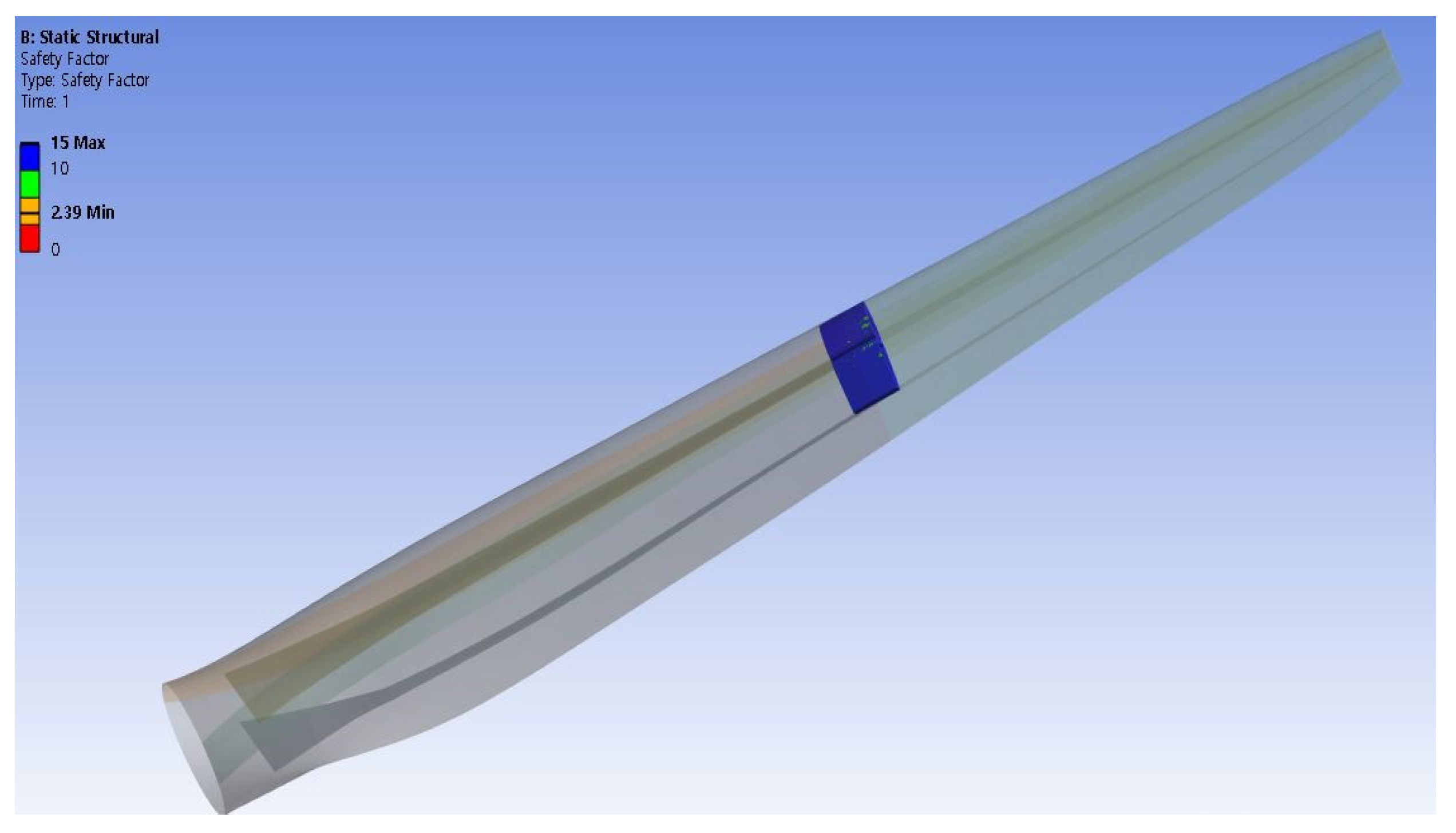 Each blade’s joint was designed to be 1 m in length and 15 cm in thickness. Basic steel properties were applied to materials. Joints between the leading edge and two spar webs were joined by adhesion. In the structural analysis process, the jointed boundary condition was applied to the blade segmentation part. The jointed condition was given to the joint part, and the safety coefficient was examined to determine whether the blade was able to be used safely while operating.