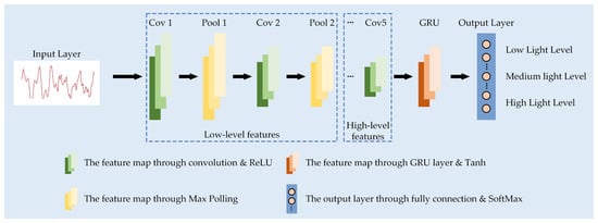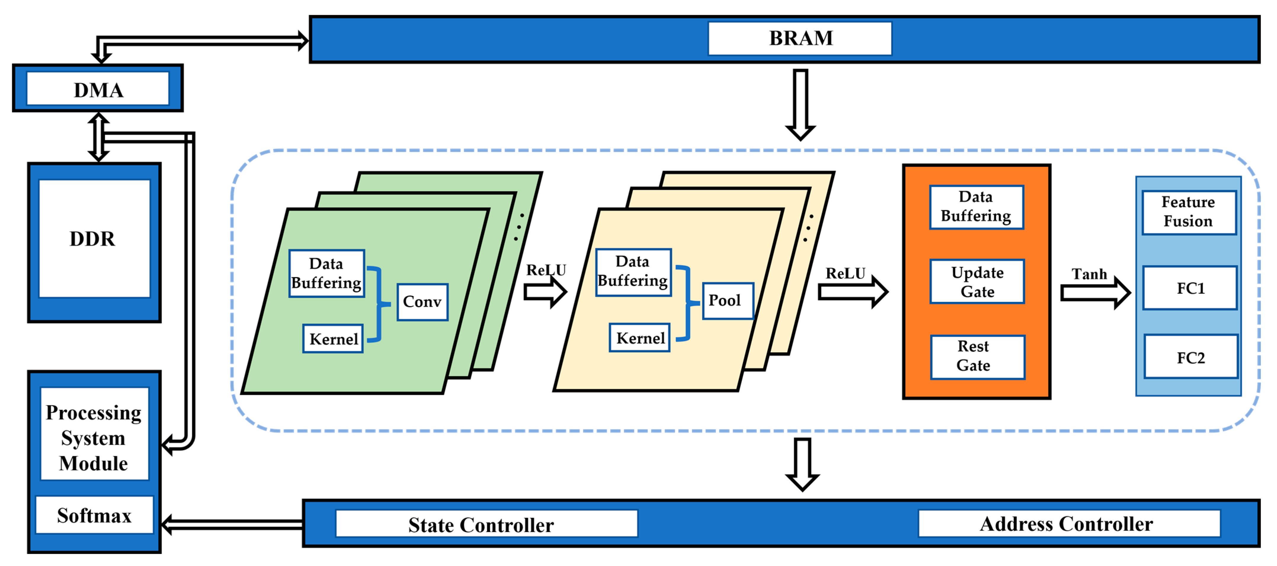 To efficiently implement 1DCNN-GRU for processing plant electrical signals on FPGA, a storage structure combining Double Data Rate SDRAM (DDR), Direct Memory Access (DMA), and Block Random Access Memory (BRAM) is used. The quantized convolutional kernel weights and biases are stored in DDR, while the input feature matrix is stored in BRAM to ensure fast parallel computation. BRAM is utilized to store input data due to its high data bandwidth, enabling more efficient data access and computation. At the same time, the quantized convolutional kernel weights and biases are stored in DDR, allowing a large set of parameters to be loaded into the FPGA and ensuring that these data can be quickly transferred to BRAM for computation when needed. Since Verilog does not support direct definition of two-dimensional arrays, a one-dimensional register array is used to replace the two-dimensional structure, with horizontal and vertical counters controlling the data access sequence to achieve efficient convolution operation execution. During the convolution operation, the kernel weights and input feature matrix of each layer are transferred from DDR to BRAM via DMA technology for parallel processing, significantly reducing the CPU load and improving data transfer efficiency. The output feature matrix is then stored back in BRAM to serve as the input data for the next layer.