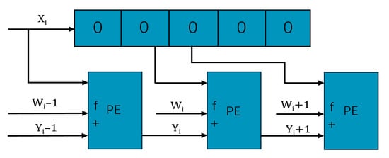 Figure 16, the convolution kernel weights are preloaded into the Processing Elements (PEs), and data flows through the PEs under the control of the clock, with the convolution multiply–accumulate results obtained at the end of the array. This design supports efficient parallel processing, where each PE can simultaneously process different parts of the data. Data only interacts with the external environment at the first and last PEs. The expression for a single processing element is given by Formula (13):