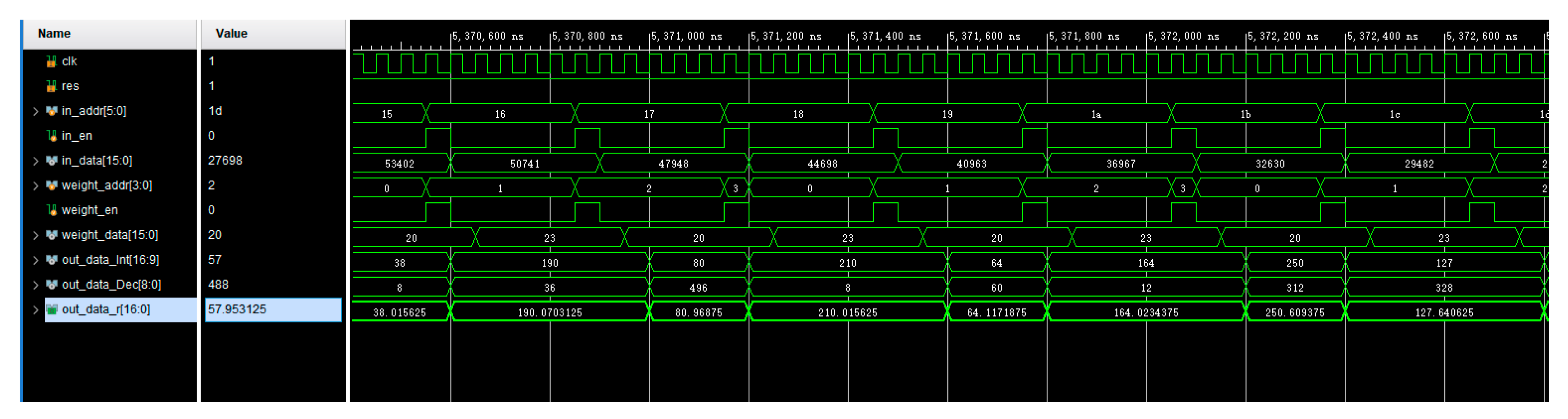 correspond to the input and weight values. The simulation demonstrates the dynamic variations in these signals during operation, which elucidates the data flow and processing within the convolution module.