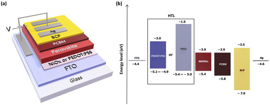 (a) Device structure and (b) energy level diagram of fabricated inverted PSCs.