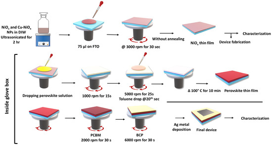The schematic of PSC device fabrication is represented in Figure 2. FTO substrates (Ruilong Optoelectronics Co., Ltd, Miaoli County, Taiwan) were patterned and cleaned in an ultrasonic bath using detergent, acetone, and isopropyl alcohol (IPA) for 10 min. Then, the substrates were dried using a nitrogen gun and UV–ozone treated for 15 min. The HTL production method was as follows: NiOx (or Cu-NiOx) NP ink was spin-coated onto the FTO substrates at a speed of 3000 rpm for 30 s. We also fabricated devices with a PEDOT:PSS HTL for comparison. The PEDOT:PSS (UNI-ONWARD Corp, New Taipei City, Taiwan) was spin-coated at 4000 rpm for 30 s and annealed at 140 °C for 10 min. Subsequently, the perovskite active layer was produced through the following procedures: 1.4 M MAI (UNI-ONWARD Corp, New Taipei City, Taiwan) and 1.4 M PbI2 (UNI-ONWARD Corp, New Taipei City, Taiwan) were dissolved in a mixed solvent of GBL/DMSO in a 7:3 ratio. The perovskite solution was stirred at 60 °C overnight and filtered using a 0.45 µm PTFE syringe filter before deposition. The solution was spin-coated onto the FTO/NiOx substrates at 1000 rpm for 15 s and 5000 rpm for 25 s. Toluene was used as an antisolvent and was added exactly 5 s before the end of the second step. The substrates were annealed at 100 °C for 10 min. The electron transport layer (ETL) production process was as follows: 20 mg/mL of phenyl-C61-butyric acid methyl ester (PCBM) in 1,4-dichlorobenzene was spin-coated on the substrates at 2000 rpm for 30 s, and a saturated solution of BCP in methanol was spin-coated at 6000 rpm for 30 s. No annealing process was performed during fabrication, except for the perovskite film. Finally, a Ag electrode was evaporated through thermal evaporation.