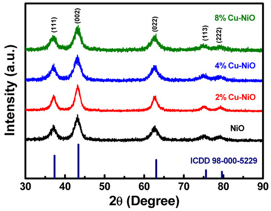 XRD patterns for pristine NiOx and various percentages of Cu-NiOx NPs are illustrated in Figure 3. The diffraction peaks at 2θ were approximately 37°, 43°, and 62°, which corresponded to the (hkl) planes of (111), (002), and (022), respectively. Two other small peaks were obtained at approximately 75° and 79°, which corresponded to the (113) and (222) planes, respectively. The (002) peak domination in all the NPs and broad peaks indicated the presence of small crystals in the synthesized NPs. The crystallite size calculated using the Debye–Scherrer formula was approximately 4–6 nm. The XRD data is presented in Table 1. The XRD results were consistent with the values of the International Center for Diffraction Data (reference number: 98-000-5229), which confirmed the existence of the cubic NiOx phase. No other peaks related to metallic copper or copper oxide were observed, which revealed that the incorporation of Cu into nickel oxide did not change its crystal structure [43].