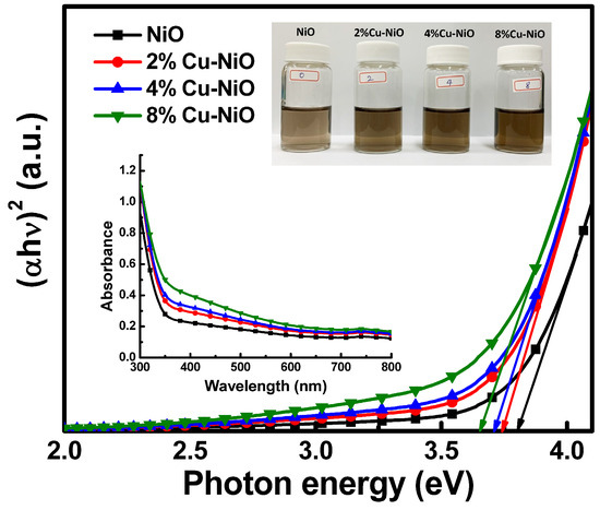 The optical bandgap, absorbance spectra, and photograph of NiOx and various concentration of Cu-NiOx nanoparticles.