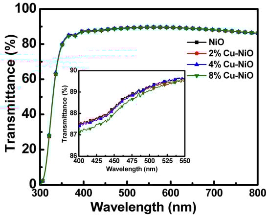 The optical properties were studied using UV-Vis spectroscopy. We measured the absorbance spectra of equally concentrated NiOx and Cu-NiOx NPs dispersed in DI water (Figure 4) in the wavelength range from 300 to 800 nm. The absorbance increased with an increase in the Cu concentration. The optical bandgaps were calculated using the standard Tauc plot method. The bandgap values were 3.8, 3.74, 3.71, and 3.66 eV for undoped NiOx, 2%, 4%, and 8% Cu-NiOx NPs, respectively. The bandgap values of synthesized NPs decreased with an increase in the Cu concentration. The incorporation of Cu atoms slightly narrowed the bandgap. The transmittance spectra of spin-coated NiOx and Cu-NiOx NPs on glass is illustrated in Figure 5, which revealed more than 85% of transmission in the visible region. The transmittance value decreased with an increase in the Cu concentration because of the narrowing bandgap.