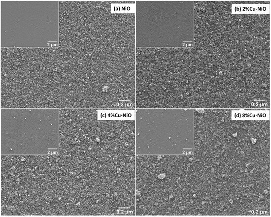 FESEM images of (a) NiOx, (b) 2%, (c) 4%, and (d) 8% Cu-NiOx spin-coated thin films.