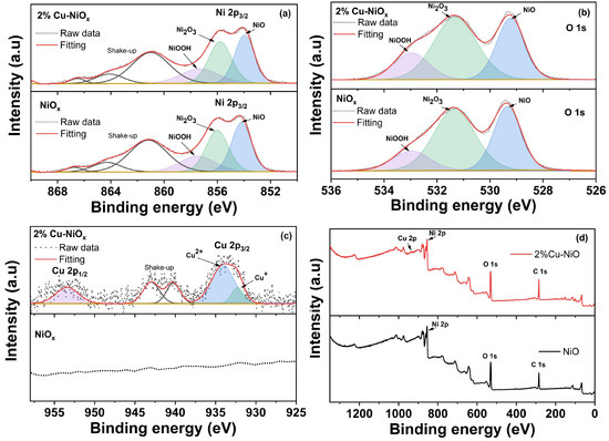 XPS spectra of (a) Ni 2p, (b) O 1s, (c) Cu 2p, and (d) survey scan for NiOx and 2% Cu-NiOx thin films.