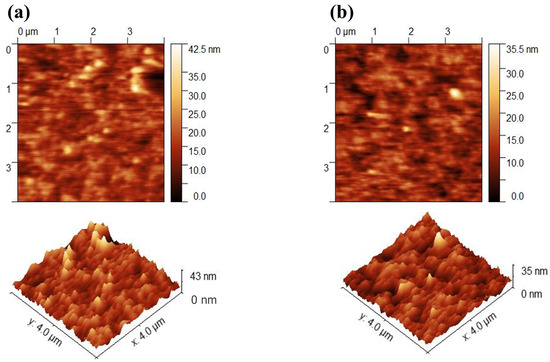 XPS was performed to examine the elemental composition of NiOx NPs and 2% Cu-NiOx films. The XPS spectra of the Ni 2p, O 1s, and Cu 2p core level are illustrated in Figure 7. The Ni 2p spectra consisted of two peaks, namely, the main peak and the shoulder peak. The deconvoluted peaks at 853, 856, and 858 eV corresponded to NiO (Ni2+), Ni2O3 (Ni3+), and NiOOH, respectively. The Ni3+ ions confirmed the presence of Ni vacancies in the film, which rendered the film a p-type semiconductor. The peak at 861 eV was attributed to the modification of the NiO structure [45,46]. There was no significant change in the Ni 2p peaks between the NiOx and Cu-NiOx thin films. The O 1s spectra exhibited three peaks at 529, 531, and 533 eV, which corresponded to NiO (Ni2+), Ni2O3 (Ni3+), and NiOOH ions, respectively. In Cu 2p spectra, the peaks located at 933 and 953 eV corresponded to Cu 2p3/2 and Cu 2p1/2 transitions, respectively. The Cu2+ peak was dominant in Cu 2p3/2 spectra, whereas the Cu+ peak was not significant [47]. The surface topography of NiOx and 2% Cu-NiOx NP thin films was investigated through AFM. Figure 8 displays the AFM images of NiOx and 2% Cu-NiOx NP thin films. The average root-mean-square roughness values of the NiOx and 2% Cu-NiOx NPs films were 4.068 ± 1.067 and 3.527 ± 0.9376 nm, respectively. The roughness decreased with Cu doping, which was consistent with reports.