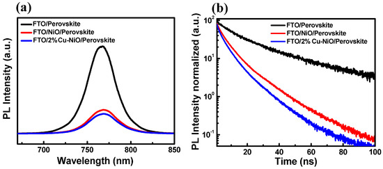 PL and time-resolved PL (TRPL) were used to evaluate charge extraction and recombination from the devices. Typically, PL quenching and a short PL lifetime are expected for perovskites in contact with charge transport layers. We measured the PL spectra and the TRPL profile of the perovskite layers deposited on various HTLs (Figure 9). The PL quenching was better for the perovskite film deposited on Cu-NiOx than for that on pristine NiOx, which indicated that Cu incorporation in NiOx improved the charge extraction property from the perovskite film. The TRPL profile was measured through time-correlated single-photon counting to analyze charge dynamics. PL lifetime decay tails were fitted with biexponential fitting function , where (τ1) is related to the diffusion of photogenerated excitons into defects, and (τ2) is related to intrinsic electron–hole recombination. The average PL lifetime value was calculated using the formula . The obtained fitting values are summarized in Table 2. The PL lifetime for the perovskite film deposited on Cu-NiOx was shorter than that of pristine NiOx, which indicates higher efficient charge transfer in Cu-NiOx.