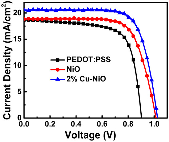 J-V characteristics of the devices made of PEDOT:PSS, NiOx, and Cu-NiOx as HTLs.