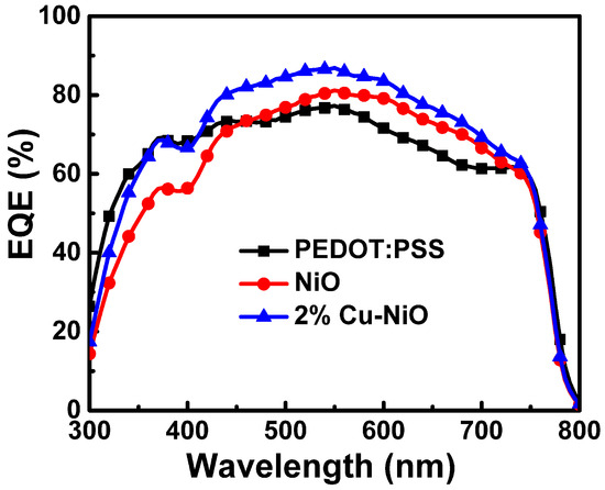 The EQE spectra of the PEDOT:PSS-, NiOx-, and 2% Cu-NiOx-based devices are displayed in Figure 11. The EQE spectra of NiOx and Cu-NiOx devices were similar, but the Cu-doped device exhibited a higher EQE value than the pristine NiOx device did. A slight difference in EQE spectra at higher wavelengths for the PEDOT:PSS device was observed. The fabricated devices exhibited satisfactory EQE values in the entire visible region. The higher EQE values in the Cu-doped device indicated that Cu-NiOx HTLs exhibited better charge transport properties.
