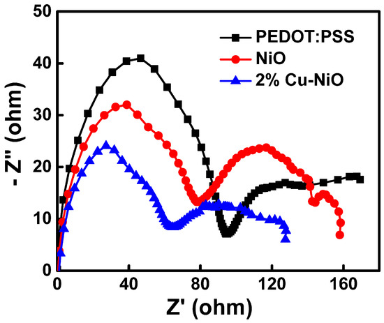 The results of EIS performed on the fabricated devices are displayed in Figure 12. The Nyquist plot for the devices fabricated using PEDOT:PSS, NiOx, and 2% Cu-NiOx were analyzed in the frequency range from 10 Hz to 1 MHz, and the AC amplitude was 0.01 V under one solar illumination at a bias of VOC. Typically, the higher-frequency regime corresponded to the charge transport resistance of the MAPbI3/HTL interface and the lower-frequency regime was attributed to a low-frequency dielectric response of the perovskite materials [48,49]. A low impedance value is more favorable to carrier transport. The EIS results indicated that the Cu-NiOx devices exhibited the lowest impedance value. This result was consistent with the J–V and EQE results.