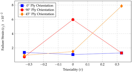 Failure strain vs. triaxiality at different ply orientations for unidirectional carbon fiber/epoxy composite used in this study.
