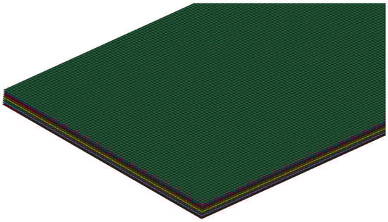 - Specification of material properties. The composite material considered in this study was a unidirectional carbon fiber/epoxy laminate, a system widely employed in aerospace and automotive applications due to its high stiffness-to-weight ratio and anisotropic strength characteristics. The orthotropic elastic constants (longitudinal modulus , transverse modulus , in-plane shear modulus , and Poisson’s ratios ) were extracted from experimental characterizations. Strength values in the longitudinal, transverse, and shear directions () were specified along with fracture toughness parameters to define the initiation and propagation of damage. These inputs provided the foundation for both the failure initiation criteria (Chang–Chang) and the subsequent MAGD-based damage evolution.