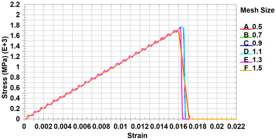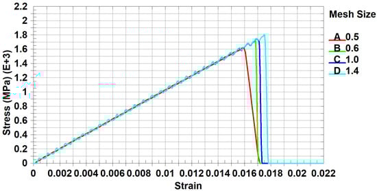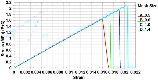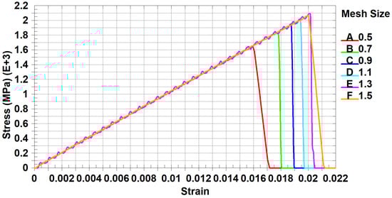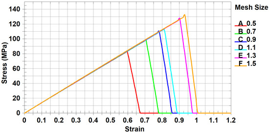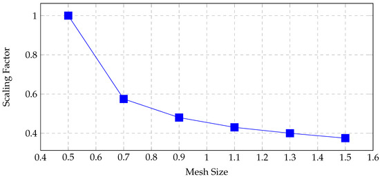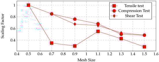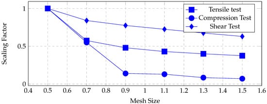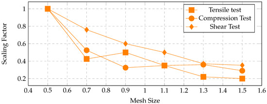 To determine the scaling factor, the failure strain () for each mesh size was calculated using Equation (16). Then the scaling factor can be determined as follows: