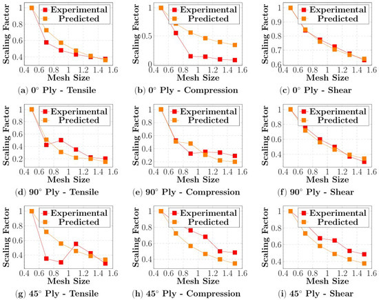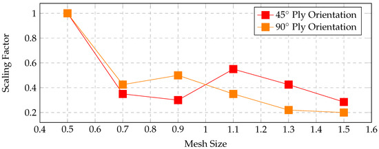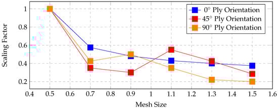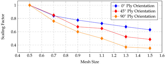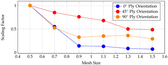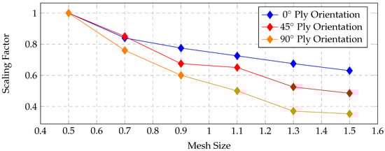 In Section 3, theoretical models are developed to predict the scaling factors as functions of mesh size. The analysis was conducted for three ply orientations (0°, 45°, and 90°) under tensile (triaxiality = 0.33), shear (triaxiality = 0.00), and compressive (triaxiality = ) loading conditions following methodologies from prior work [30,31,53]. These loading conditions were selected to capture the combined influence of the stress state and fiber orientation on composite failure, in line with the findings of Korgesaar et al. [36,37].
