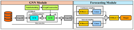 The proposed model in this work is shown in Figure 1 and has a two-stage architecture. In the first stage, an adaptive GNN framework is employed to facilitate interactions among variables. This adaptive GNN can automatically extract relationships between node variables from the data to construct an adjacency matrix. Using the adaptively learned adjacency matrix, the framework integrates PV power generation with other environmental variables. The resulting interactively enhanced time series data are then fed into the forecasting module. The forecasting module employs both continuous and interval sampling strategies to extract both local and global temporal features, enabling multi-horizon predictions of PV power generation.