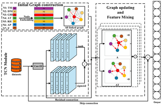 With the rapid advancement of machine learning and deep learning technologies, statistical methods have been gradually supplanted by deep learning approaches. In contrast to traditional methods, deep learning methods exhibit stronger nonlinear modeling capabilities and adaptability. They are better equipped to handle complex time series data [15]. The mainstream methods for PV power prediction can be classified into models based on RNN and CNN. For instance, LSTM and BiLSTM, two improved versions derived from RNN, are employed to extract the inherent temporal relationships within PV sequences [16]. Wang et al. [17] enhanced the LSTM model for PV power prediction by incorporating a frequency domain decomposition method, and this approach demonstrated superior prediction performance. Agga et al. [18] proposed CNN-LSTM and ConvLSTM models to forecast the power generation of PV power plants. The results indicated that both CNN-LSTM and ConvLSTM outperformed the LSTM model. Additionally, TCN, a novel convolutional architecture designed for sequential modeling, has shown excellent performance in PV power generation prediction and has been proven to outperform deep learning models such as CNN and LSTM [19]. Xiang et al. [20] introduced a hybrid model combining TCN and LSTM and found that it was more effective in capturing the complex long-term dependencies of spatial and temporal features compared with the CNN-LSTM model. Previous studies on PV power generation prediction using TCN typically involved constructing models by integrating shallow TCN with LSTM. Nevertheless, shallow TCN might not be able to capture the latent temporal patterns and fine-grained temporal information in PV sequences [21]. Moreover, previous methods often relied on a single neural network to extract the spatial relationships among variables, overlooking the fact that the spatial and temporal relationships in multivariate time series are intertwined.