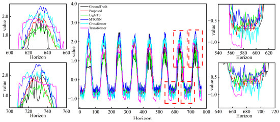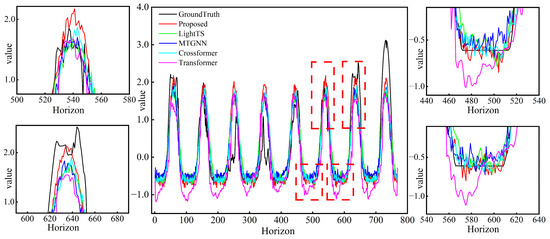 As indicated by the above results, the proposed model demonstrated strong performance in long-term forecasting tasks. We visualized the predicted and true PV power curves for the forecasting horizon of 768 steps. The top five baseline models, along with the proposed model, are compared in Figure 4, Figure 5 and Figure 6. While all models showed comparable capability in capturing the overall trends in power generation, the proposed model exhibited notably superior performance in identifying the peaks, troughs, and fluctuations of the PV power output. Compared with the baseline models, its predictions during periods of power variation aligned more closely with the true values, indicating s higher accuracy in both trend capture and fine-grained variation modeling. These characteristics highlight the model’s strong adaptability and high predictive accuracy when handling complex and dynamically changing long-term time series data.
