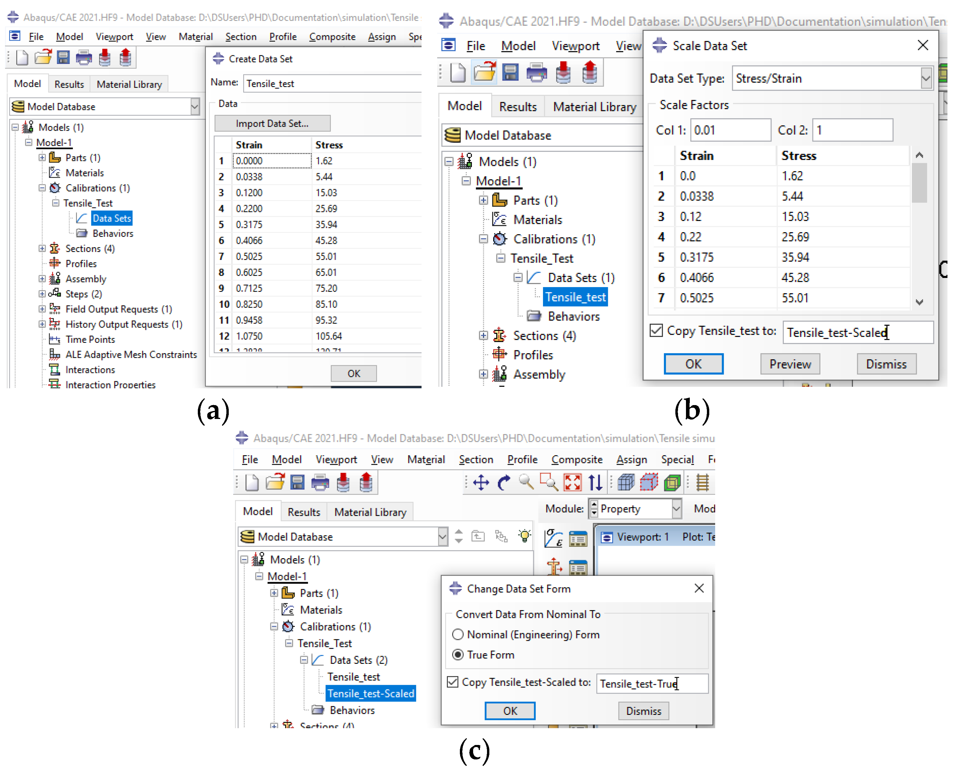 (a) Engineering stress–strain data import; (b) Scale strain from % to mm/mm; (c) Conversion from engineering to true stress–strain data.