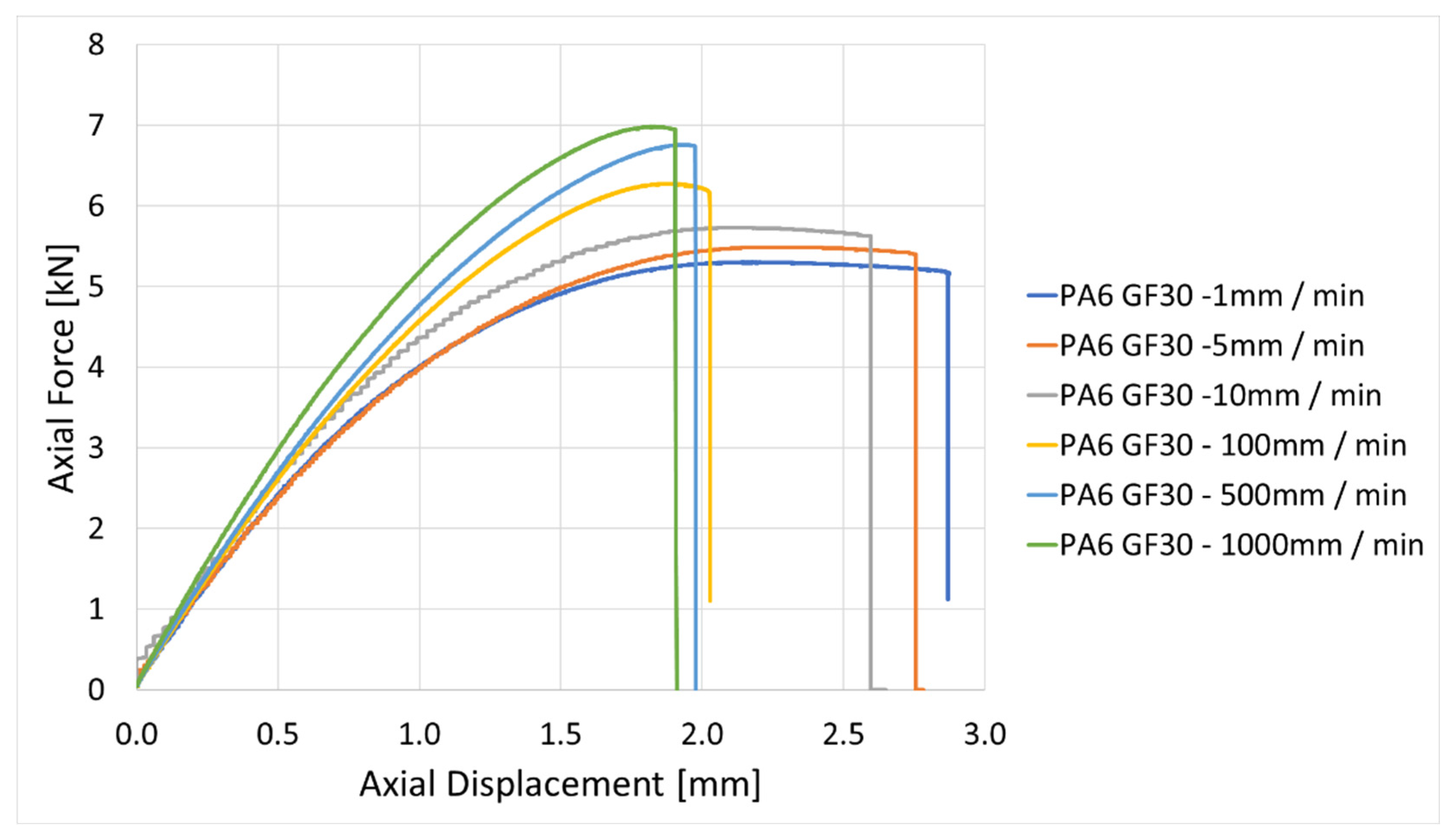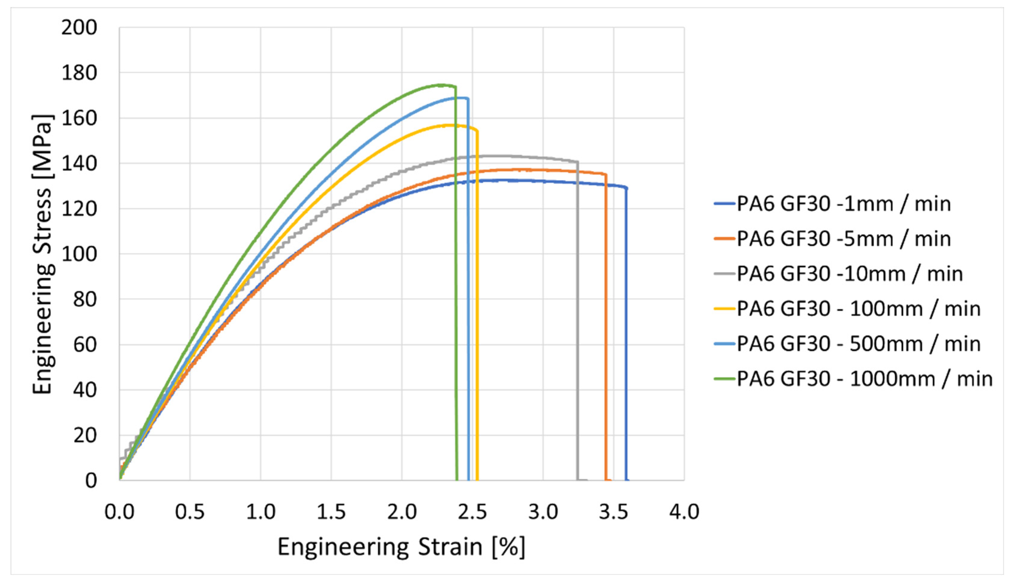 The experimental investigation shows a clear sensitivity of PA6 GF30 towards strain rate. With increasing the speed from 1 to 1000 mm/min, it was noticed that the maximum stress increased by approximately 30%, while the elongation at break decreased by about one third—the trend was consistent throughout all the samples tested, confirming the strong dependency of the mechanical properties of the PA6 GF30 to strain rate.