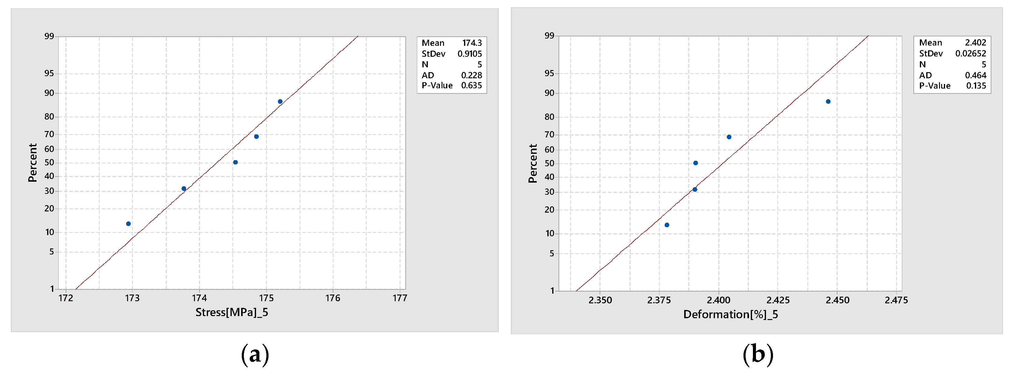 Anderson–Darling test evaluation for (a) stress and (b) strain.
