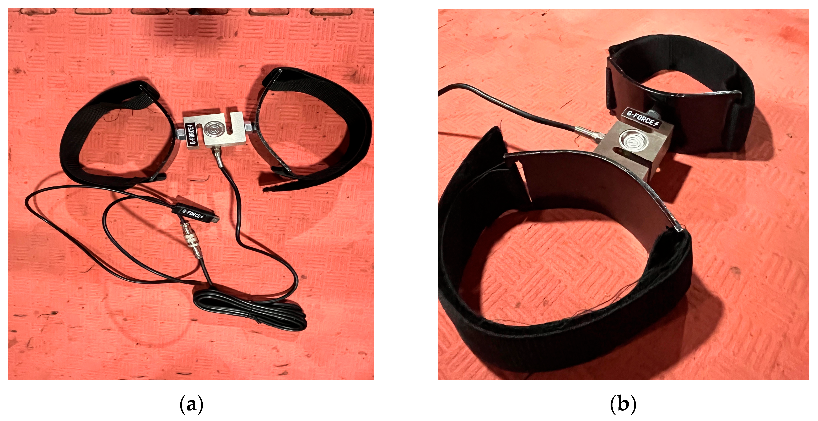 19]. The calibration consisted of establishing a linear relationship between the sensor’s electrical signal and a known reference load. Specifically, a certified 5 kg (≈49.05 N) mass was used, suspended by a hanging system to simulate tensile conditions comparable to those used in hip abduction and adduction tests. This procedure allowed for verification of basic linearity within the limited force range used in the present study. Subsequently, a horizontal tare (zeroing) was performed with the sensor in a stable position to cancel the weight of the device itself and any attached accessories, in accordance with the manufacturer’s recommendations. However, no more exhaustive validation procedures were performed, such as evaluation of hysteresis, full-range linearity, or sensitivity, which is acknowledged as a limitation of this study.