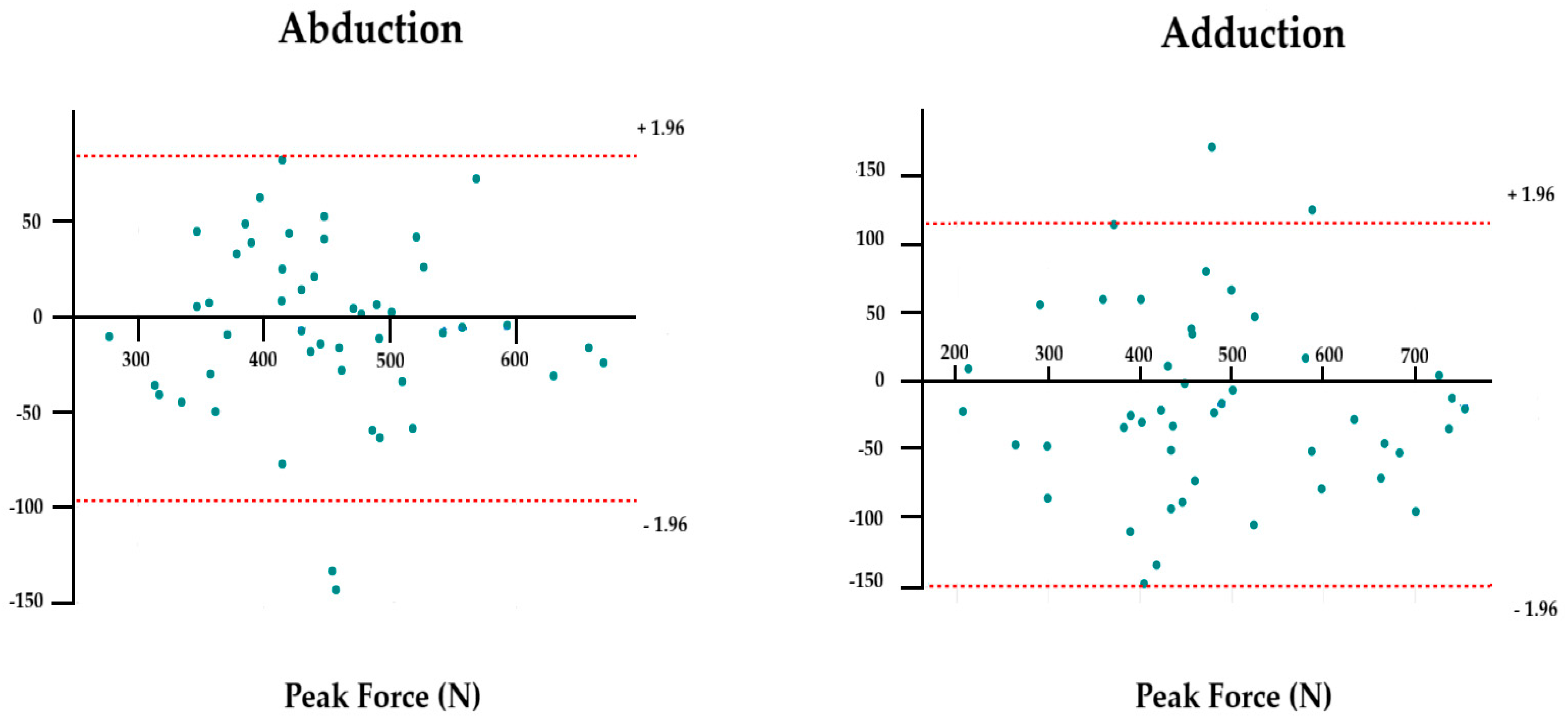 Bland–Altman analysis revealed negligible bias values for peak force in both abduction (−6.54 N) and adduction (−17.57 N), confirming the absence of systematic error and supporting the stability of this parameter [