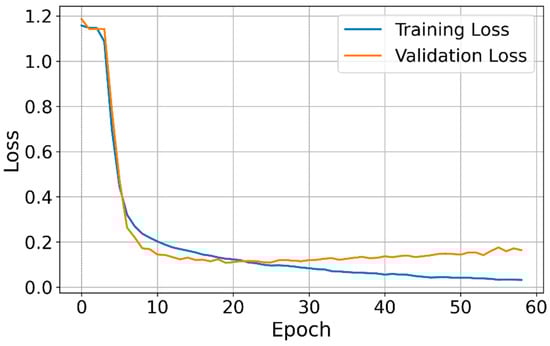 The Hybrid converged well during training, with only mild signs of overfitting. As shown in Figure 2, the training and validation loss decreased steadily and rose slightly near the end, indicating the onset of overfitting. Convergence was otherwise stable, and each epoch required approximately 31.3 s, with a total training time of about 21 min for 40 epochs on an NVIDIA V100 GPU (NVIDIA Corporation, Santa Clara, CA, USA).