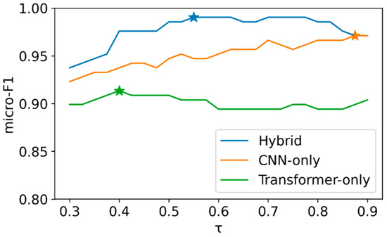 Micro-F1 versus decision threshold τ for Hybrid, CNN-only, and Transformer-only models. The five-pointed stars indicate the optimal thresholds yielding the highest micro-F1 scores for each model. Hybrid dominates across decision thresholds (τ), showing a broad operating plateau, confirming robustness to threshold choice.