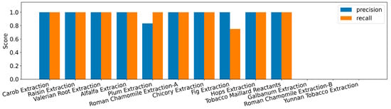 Per-class precision and recall at τ = 0.70 on the real NMR mixtures. Most ingredients are predicted almost perfectly; small deviations occur for rarely occurring flavors.