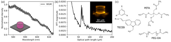 (a) Fluorescence emission spectrum for a cylindrical WGM resonator showing interference, and (b) the corresponding Fourier transform of the signal. The inset contains an image of the structure excited under a fluorescence microscope. (c) Chemical structures of PETA, PEG-DA, and TECEB photoinitiator monomers.