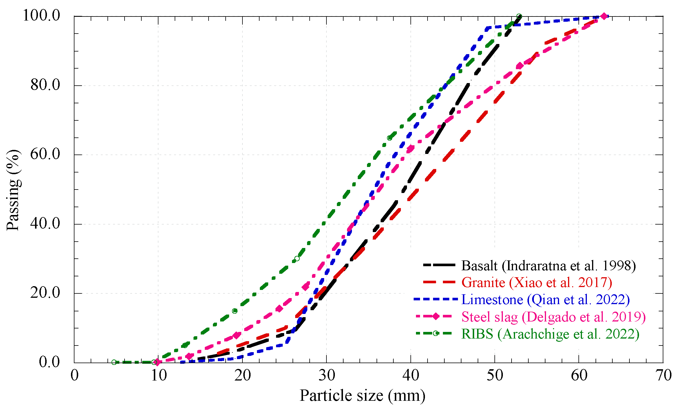 | Lim et al. [32] | Compression tests were performed on six types of rock to analyze the strength of the ballast, evaluating the results with the Weibull distribution to explore the relationship between size and strength. | The strengths of the ballast conform to the Weibull distribution, but the relationship between size and strength differs from the theory due to factors such as quarry processing and surface fractures, which limit the applicability of the model. |