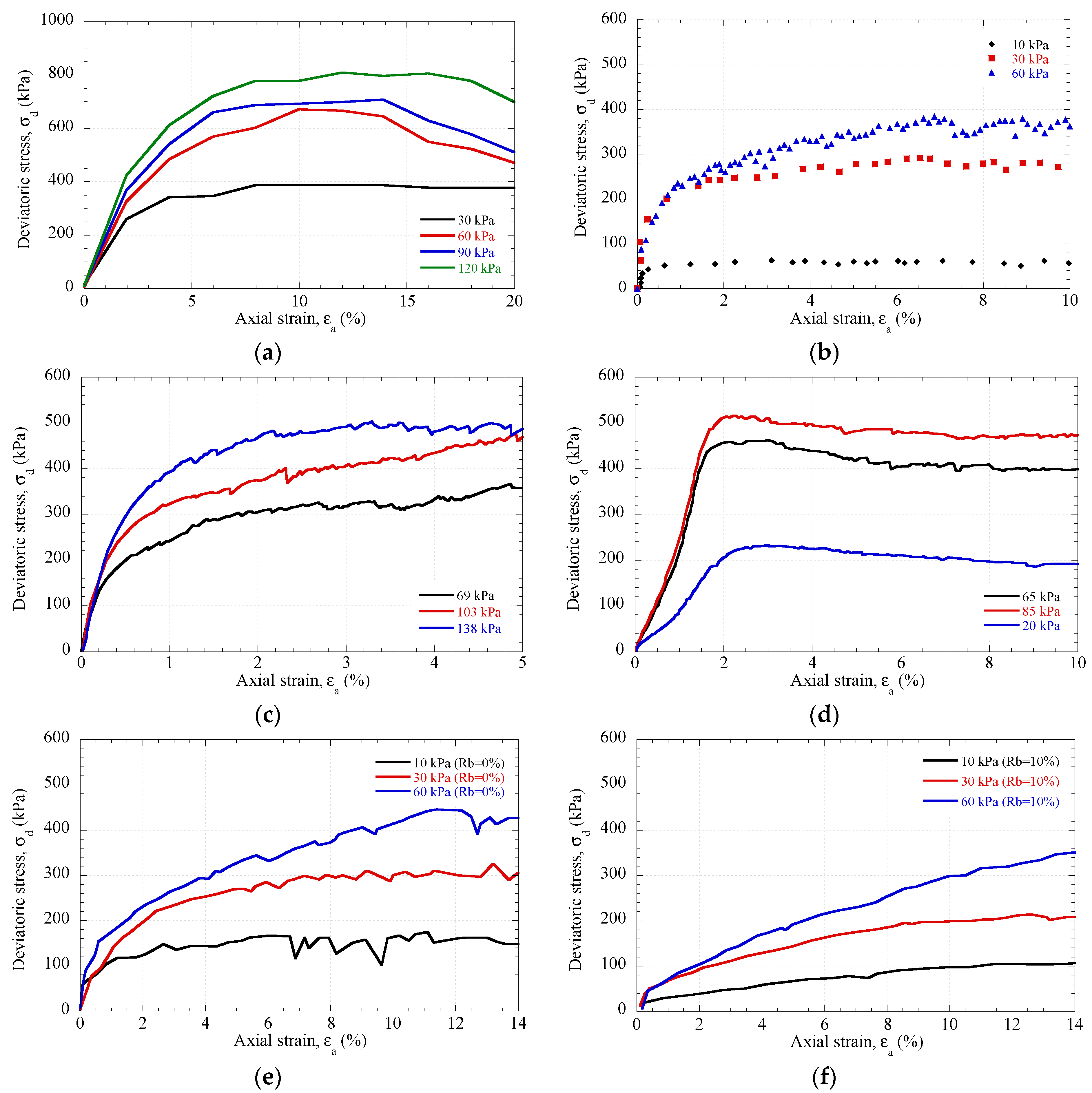 - Leshchinsky, B.; Ling, H. Effects of geocell confinement on strength and deformation behavior of gravel. J. Geotech. Geoenviron. Eng. 2013, 139, 340–352. [Google Scholar] [CrossRef]