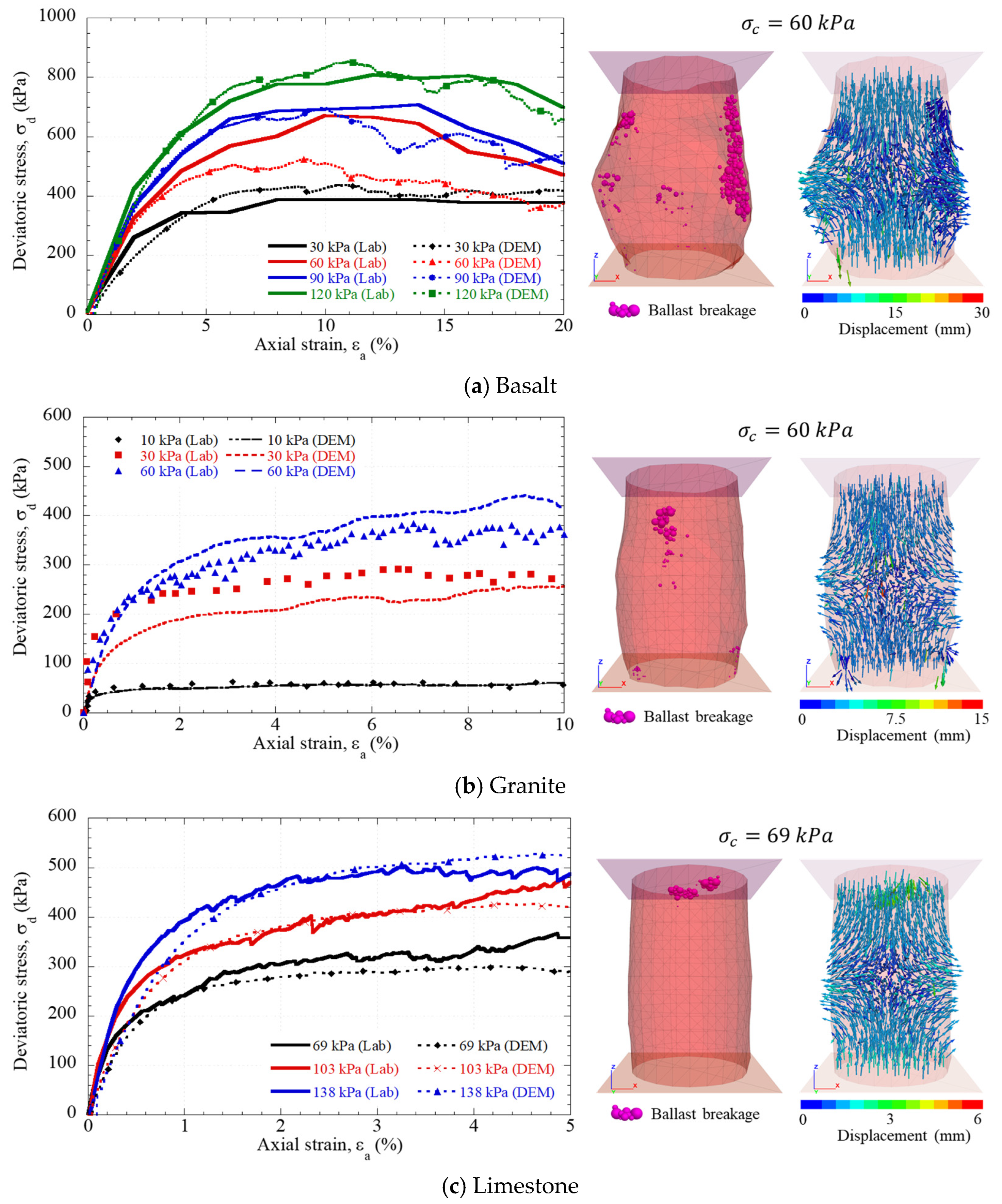 | Lu and McDowell [31] | The study uses the Discrete Element Method (DEM) to simulate the behavior of ballast under monotonic and cyclic loads, replicating shear strength and volumetric response, validated experimentally. | The model shows that shear strength varies with confining pressure and ballast size, being less sensitive to pressure in small particles. The number of roughness features influences the peak friction angle, but not the residual friction angle. |
