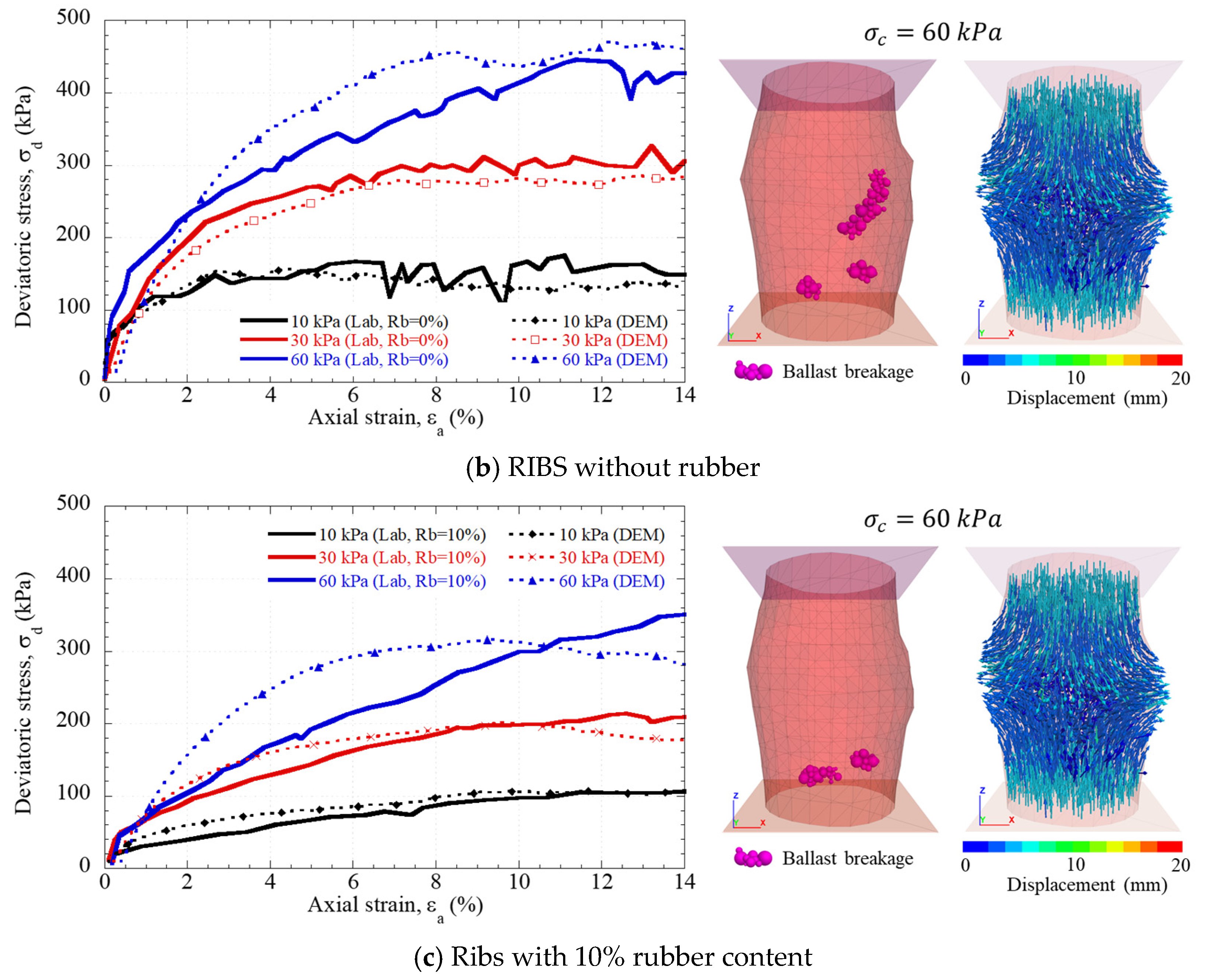 - Zhang, F.; Yao, Q.; Wang, H.; Feng, H.; Chang, J.; Lu, L.; Jiang, M. DEM analysis of the cyclic behavior of ballast mixed with crumb rubber. Constr. Build. Mater. 2023, 375, 130975. [Google Scholar] [CrossRef]