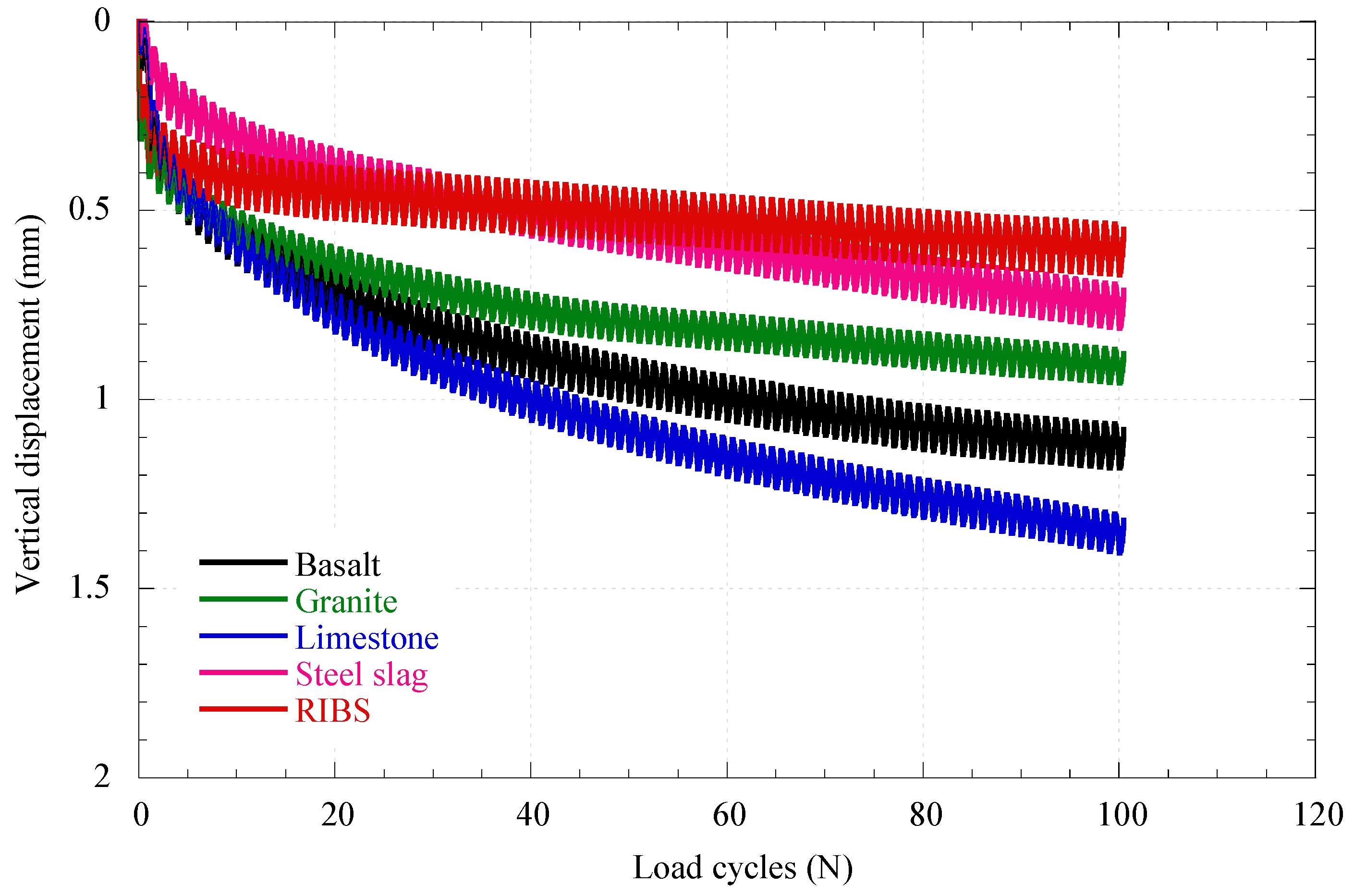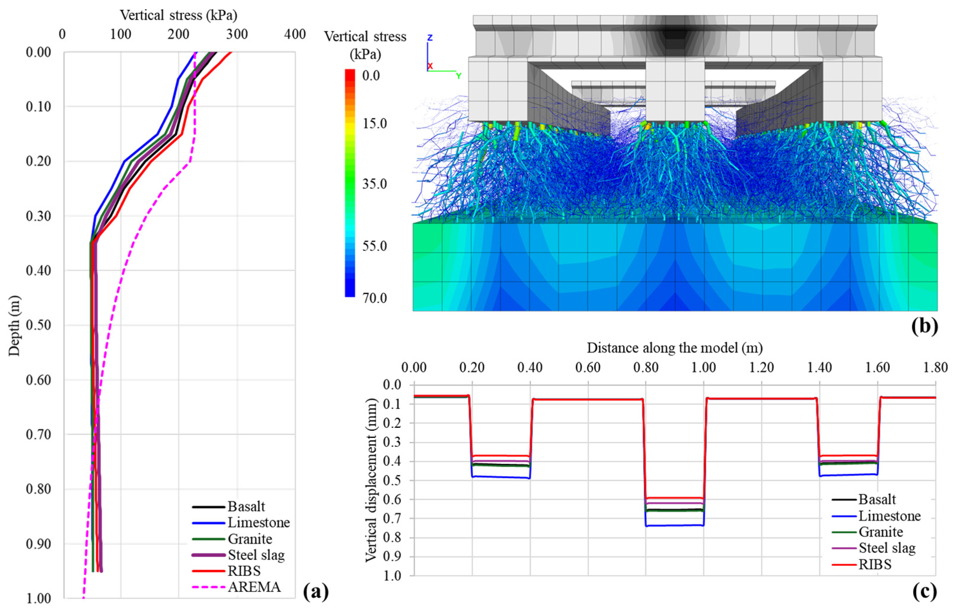 - The conventional materials (basalt, granite, and limestone) followed similar displacement trajectories, though with distinct magnitudes of settlement. Limestone showed the most significant final displacement (1.32 mm), followed by basalt (1.08 mm) and granite (0.71 mm). After 100 load cycles, all materials produced vertical stresses exceeding empirical estimates, except for the RIBS model, which reached a maximum stress of 177 kPa and exhibited a more uniform stress distribution.