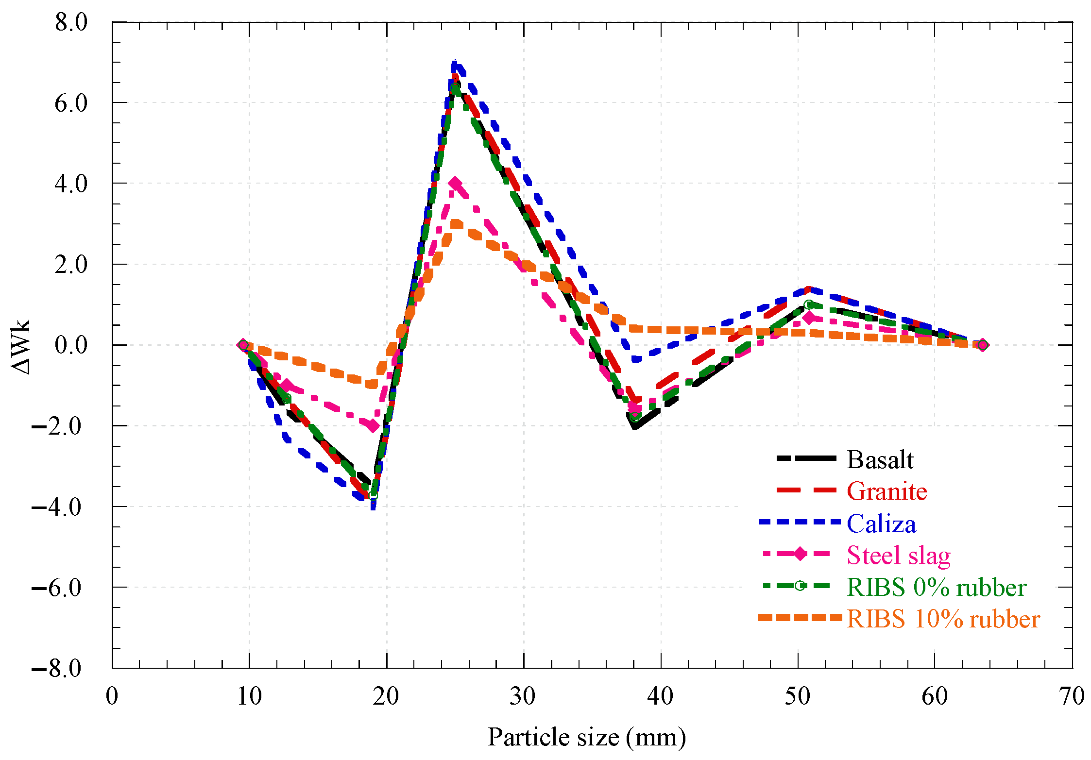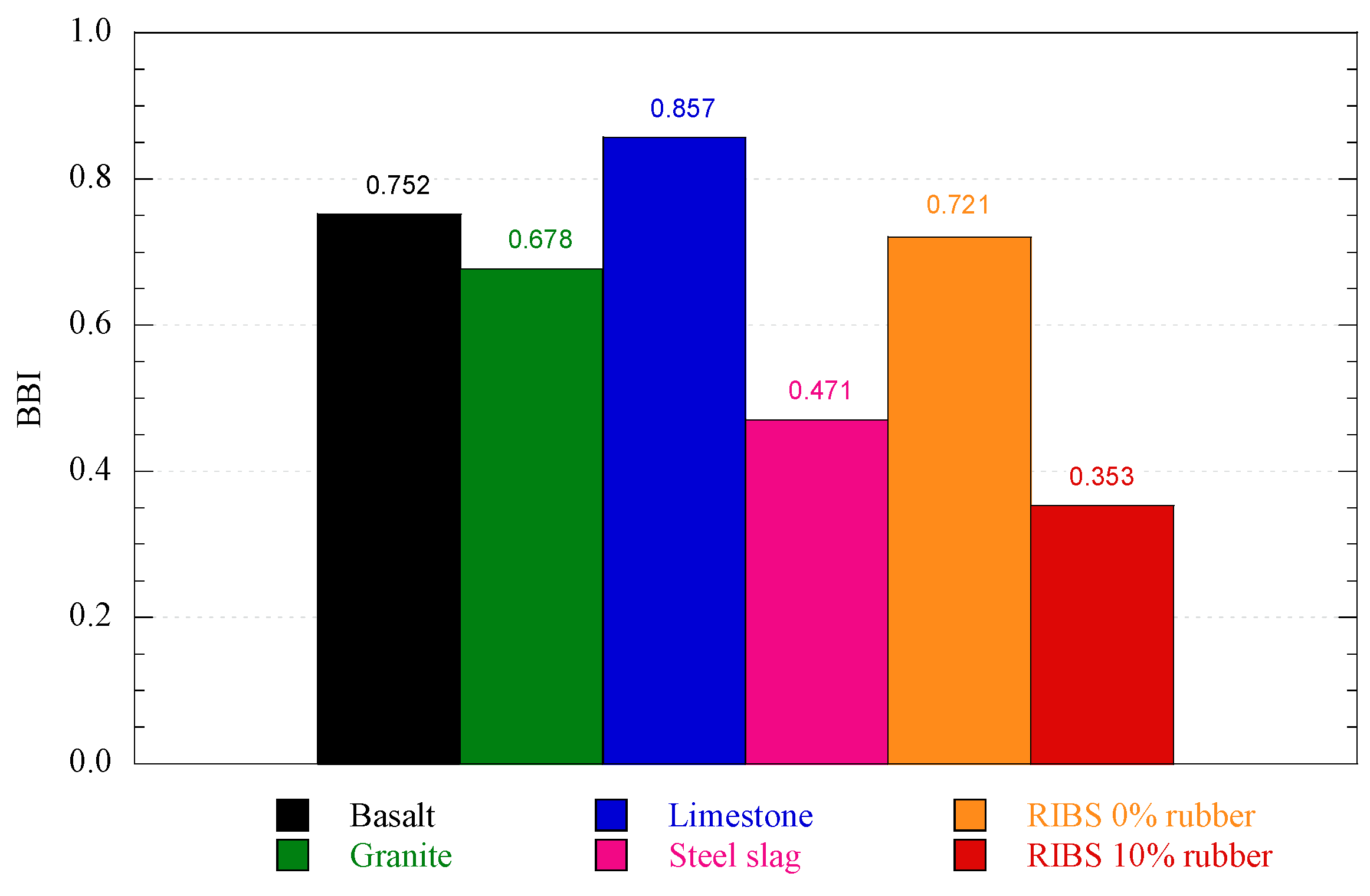 - The incorporation of 10% rubber into the basalt ballast significantly improved mechanical performance: the BBI decreased by 51.0% (from 0.721 to 0.353), and the Marsal breakage index (Bg) reduced by 49.4% (from 7.373 to 3.729). These results confirm the effectiveness of rubber intermixing in reducing particle degradation and enhancing ballast resilience.