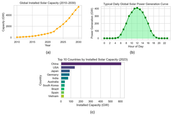 Trends and global landscape of solar photovoltaic (PV) deployment. (a) Global cumulative installed solar PV capacity from 2010 to 2030. Historical data from 2010 to 2023 are based on IEA and IEA-PVPS reports, while projections from 2024 to 2030 reflect current deployment trends and global energy transition targets. (b) A typical daytime solar power generation profile under clear-sky conditions, highlighting peak generation around midday and zero output during nighttime. (c) Installed solar PV capacity of the top 10 countries as of 2023, showcasing China’s dominant position, followed by the USA, Japan, and Germany. Data emphasizes both the rapid growth and geographic distribution of solar power infrastructure globally.