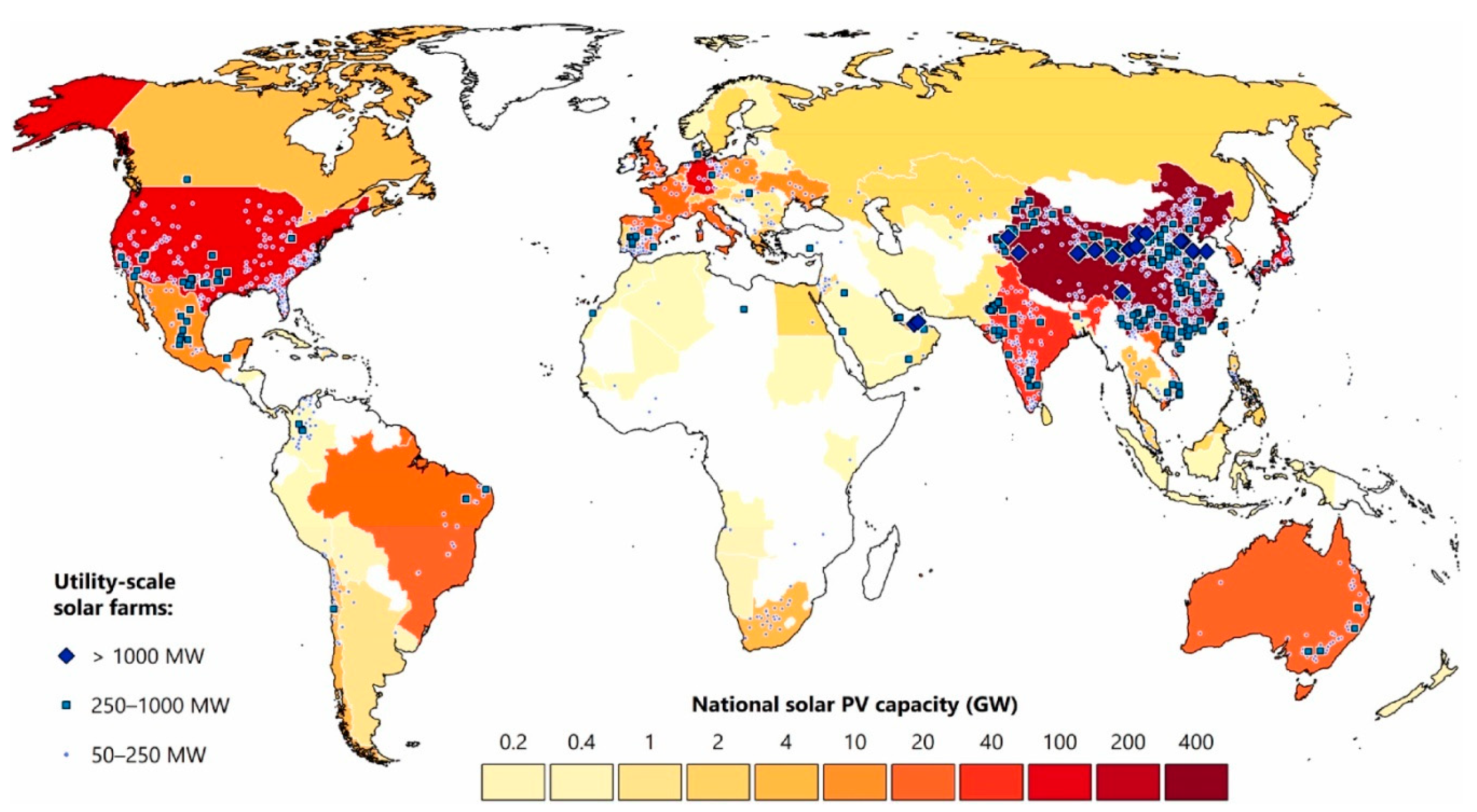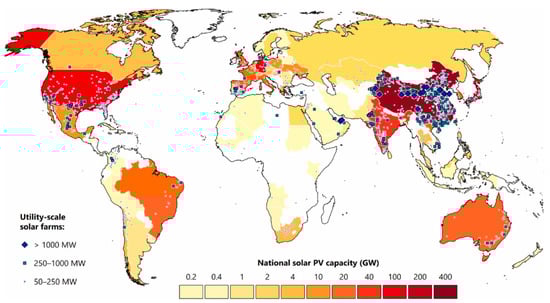 The rising global energy demand has intensified the search for sustainable and environmentally friendly energy sources, with solar energy emerging as a leading candidate. Two decades ago, the production and deployment of solar energy systems posed significant challenges due to complex manufacturing processes and high costs. However, advancements in photovoltaic (PV) technology and improved grid integration have streamlined these processes, making solar power more accessible and efficient. Despite these advancements, solar energy systems, like any other power infrastructure, are prone to operational failures. Performance degradation over time—caused by panel aging, inverter malfunctions, and grid-related issues—can result in energy losses and increased maintenance costs [4,5]. To optimize the performance and longevity of grid-connected PV systems, reliability-centered designs have become essential. Various factors contribute to system malfunctions, including environmental conditions, manufacturing defects, and improper installation practices. Common issues such as shading, inadequate cleaning, poor electrical connections, inverter failures, and grid disturbances can significantly reduce system efficiency or, in severe cases, cause complete shutdowns. Understanding these failure mechanisms and their impact on PV system performance is crucial for researchers, engineers, and industry professionals to develop more robust, efficient, and resilient solar energy solutions [6,7]. Figure 2 shows the globally installed capacity of solar power at different locations of the world, with the largest individual solar farms, in which shady colors indicate greater installed capacity and larger farms; countries have solar generation <0.1 GW.