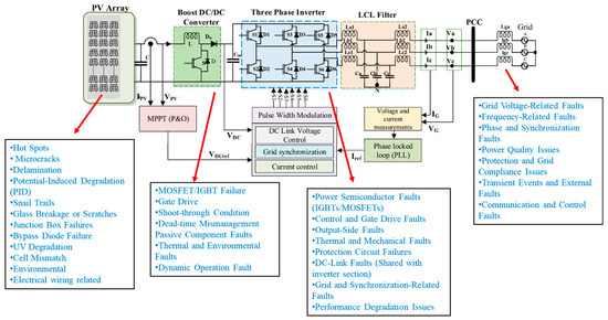 Since grid-connected PV systems consist of multiple interconnected subsystems, a failure in any single component can disrupt the entire operation. As a result, predictive maintenance at the subsystem level is crucial for ensuring continuous power generation and avoiding unexpected system failures. Since the overall system consists of multiple interconnected subsystems, a fault in any one of them can disrupt the entire operation. Therefore, implementing predictive maintenance at the subsystem level is crucial to ensuring system reliability and preventing unexpected failures. Figure 3 represents the general block diagram of a three-phase integrated grid-connected PV system (IGCPS) multilevel inverter for a solar photovoltaic (PV) system.