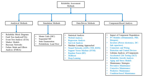 Reliability assessment is essential for ensuring stable, safe, and efficient operation of solar photovoltaic (PV) systems, as it helps identify potential issues that can lead to reduced performance, energy losses, or unexpected failures. Accurate reliability evaluation enables proactive management, minimizes downtime, optimizes maintenance strategies, and significantly enhances system lifespan and sustainability [28]. As shown in Figure 5, reliability methodologies are broadly categorized into analytical methods (e.g., Fault Tree Analysis, Markov Models), simulation approaches (e.g., Monte Carlo simulations), data-driven techniques (e.g., Machine Learning and statistical methods), and component-based reliability analyses that include studying degradation impacts and maintenance strategies. Selecting appropriate methods from these categories is crucial to comprehensively assess and improve PV system reliability [29].