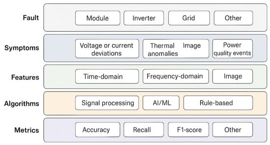 Contrary to previous reviews that concentrate on PV fault categories or single diagnostic methods, this review proposes a complete taxonomy that connects fault types → observable symptoms → signals → diagnostic methods → metrics of the diagnostic methods → field-readiness levels. This hierarchical arrangement captures the relationship between diagnostic methods and specific fault behaviors. Additionally, a criterion is proposed to assist PV plant operators in the choice of monitoring and maintenance methods based on system type, which may be residential, commercial, or utility, and voltage levels (LV, MV, and HV) [30]. These contributions provide coherent guidance that links the theoretical and practical aspects of PV fault detection and predictive maintenance. Our unified taxonomy and decision framework, illustrated in Figure 6, goes beyond simply aligning fault types, symptoms, signals, diagnostic techniques, and field-readiness levels. It also contextualizes each case and recommends prescriptive actions. Take, for instance, the case of a utility-scale medium-voltage (MV) plant where symptoms of potential-induced degradation (PID) are recurring. The framework identifies, designs, and prioritizes monitoring techniques that can help implement the recommended adjustments to reduce energy loss and improve reliability [31,32].
