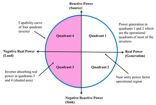The integration of grid-connected solar PV systems introduces several power quality challenges, including voltage fluctuations, frequency instability, harmonic distortions, and reactive power management issues. These factors can affect grid stability, reliability, and the overall efficiency of power distribution networks [39]. One of the primary concerns is voltage fluctuations, which arise due to the intermittent nature of solar power generation [40]. Since solar PV output varies based on solar irradiance, cloud cover, and weather conditions, the grid experiences sudden voltage surges and drops. These fluctuations are especially problematic in weak distribution networks with a high penetration of solar PV, leading to voltage instability and power quality deterioration [41]. Another significant issue is harmonic distortion, which occurs due to the conversion of DC electricity to AC using inverters. Poorly designed inverters inject harmonic currents into the grid, which can interfere with sensitive electronic devices, reduce transformer efficiency, and increase transmission line losses. Higher-order harmonics can also cause overheating in electrical equipment, further degrading power system performance [42]. Additionally, frequency instability becomes a growing concern with increased solar PV penetration. Unlike conventional power plants, which have large rotating generators providing inertia for frequency regulation, solar PV systems lack inherent inertia. This leads to rapid frequency deviations, requiring additional frequency regulation mechanisms such as battery energy storage systems (BESSs), and synthetic inertia from advanced inverters, or fast-response backup generation [43]. Another crucial factor is reactive power management, which is essential for maintaining voltage stability and power factor correction [44]. Many traditional solar inverters are designed to operate at a unity power factor, meaning they do not inject or absorb reactive power. Without proper reactive power compensation, voltage fluctuations and power losses increase, impacting overall grid efficiency. Advanced power electronics, dynamic reactive power compensators, and grid-supportive smart inverters are now being implemented to enhance power factor control and improve grid stability [45,46].