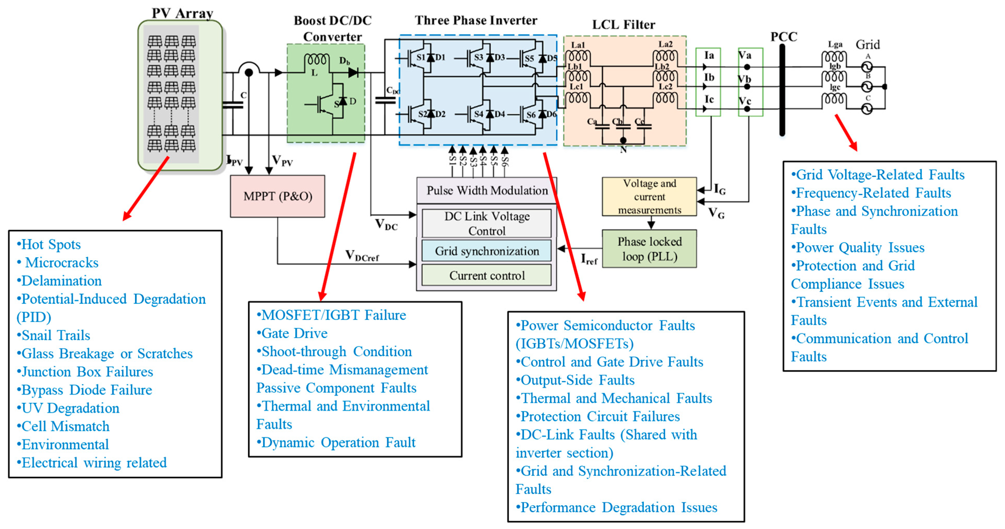 Solar PV systems that are connected to the grid tend to have several faults and failures that may alter their effectiveness, efficiency, and even longevity. The issues can be classified as electrical, mechanical, and environmental faults. Electrical faults include the inverter and MPPT (Maximum Power Point Tracking) failures alongside arc faults, which directly contribute to loss of power or might even cause hazardous situations. Mechanical failures like cracked panels, badly made solder joints, and damaged mounting structures may follow winds, hail, and poor installation. Increased dust, shading, and higher or lower temperatures are all Environmental Factors that reduce the efficiency of systems over time. In addition, grid-related problems such as changing voltages and shifting frequencies may result in disconnecting or a lesser power contribution. Predictive maintenance and monitoring systems, as well as fault detection algorithms, are the key measures to ensure the reliability and stability of grid-connected solar PV systems [86].