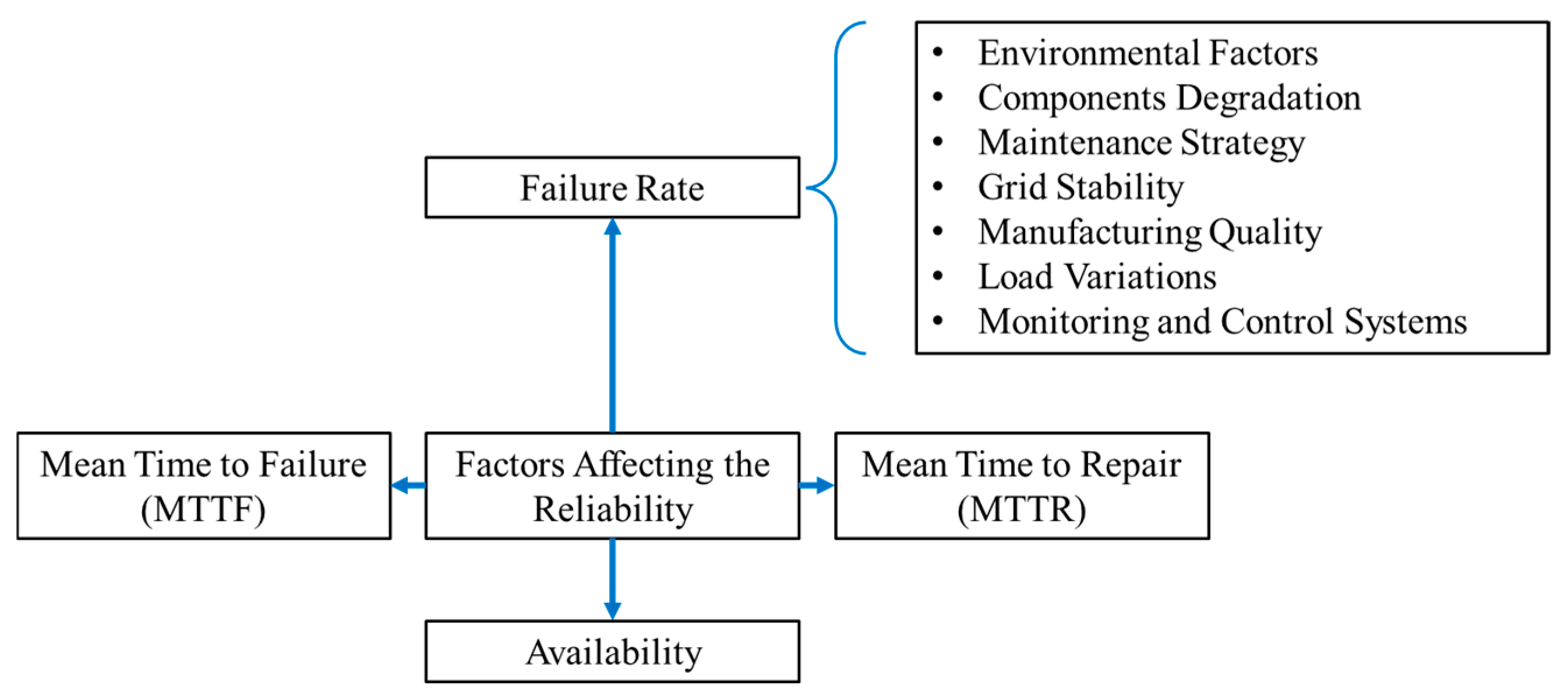 Despite these advancements, fully automated and efficient fault detection systems for grid-connected PV systems are still under development. Challenges such as integration of diverse data sources, lack of standardized diagnostic protocols, high implementation costs, and cybersecurity concerns must be addressed to ensure secure and effective predictive maintenance [24]. To further enhance predictive maintenance, emerging technologies such as Blockchain for secure data management and digital twins for real-time system modeling hold significant potential. Future research should focus on improving AI-based fault detection accuracy, enhancing sensor technology, and developing cost-effective maintenance strategies [25]. Given the increasing global reliance on solar energy, reliable grid-connected PV systems are essential for maximizing energy efficiency, minimizing operational costs, and maintaining grid stability. As predictive maintenance continues to evolve, it will play a pivotal role in ensuring prolonged system reliability, optimizing energy output, and reducing maintenance costs [26,27]. Figure 4 represents the basic factors defining the reliability and availability of the system.