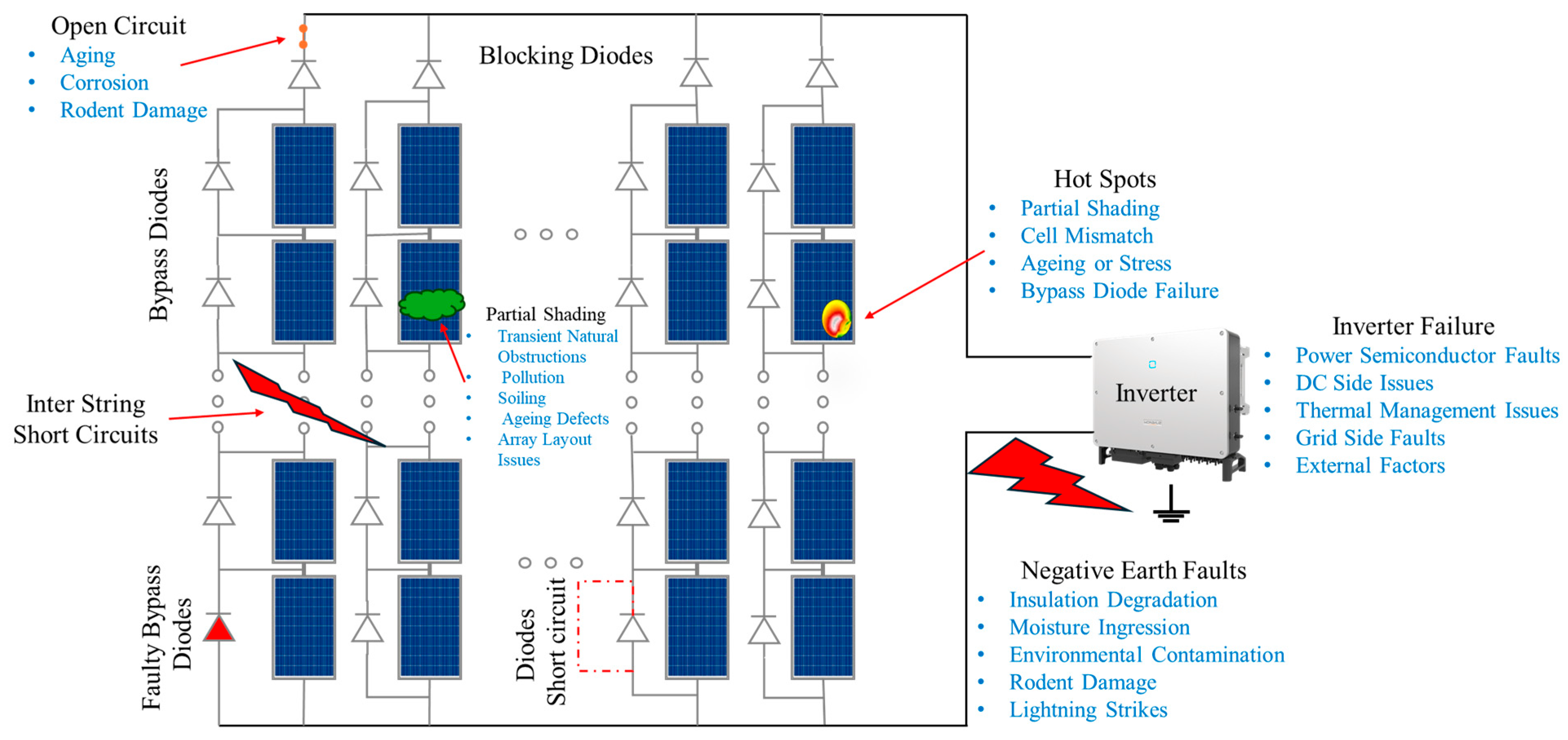 Faults in grid-connected solar PV systems arise from electrical, mechanical, and environmental factors, each contributing to system underperformance and potential failures. Some of the most common failure mechanisms include the following: