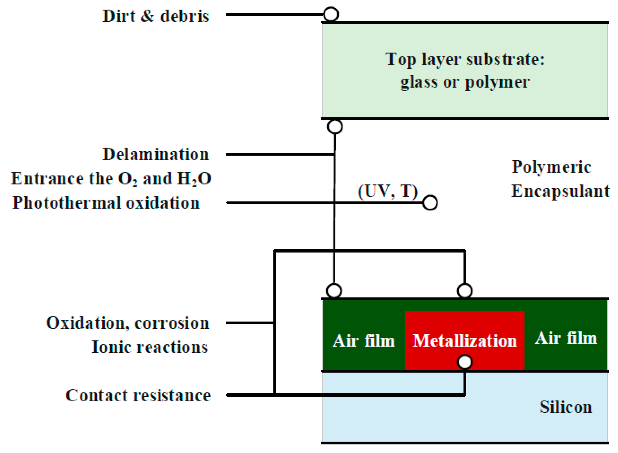 Solar PV systems are exposed to various environmental stressors that gradually degrade their performance and longevity. One of the most common issues is soiling, where dust, dirt, bird droppings, or other particulate matter accumulate on the surface of PV panels, reducing their ability to absorb sunlight efficiently. Regular cleaning schedules and self-cleaning coatings can help mitigate this issue. Corrosion and thermal stress are also major concerns, particularly in coastal or highly humid environments. Moisture ingress and salt deposits can lead to material degradation, impacting electrical contacts, frames, and junction boxes. Similarly, thermal cycling—constant expansion and contraction due to fluctuating temperatures—can create micro-cracks in solar cells, leading to hot spots, power losses, and potential long-term failure [89]. Figure 8 shows the degradation process through delamination.