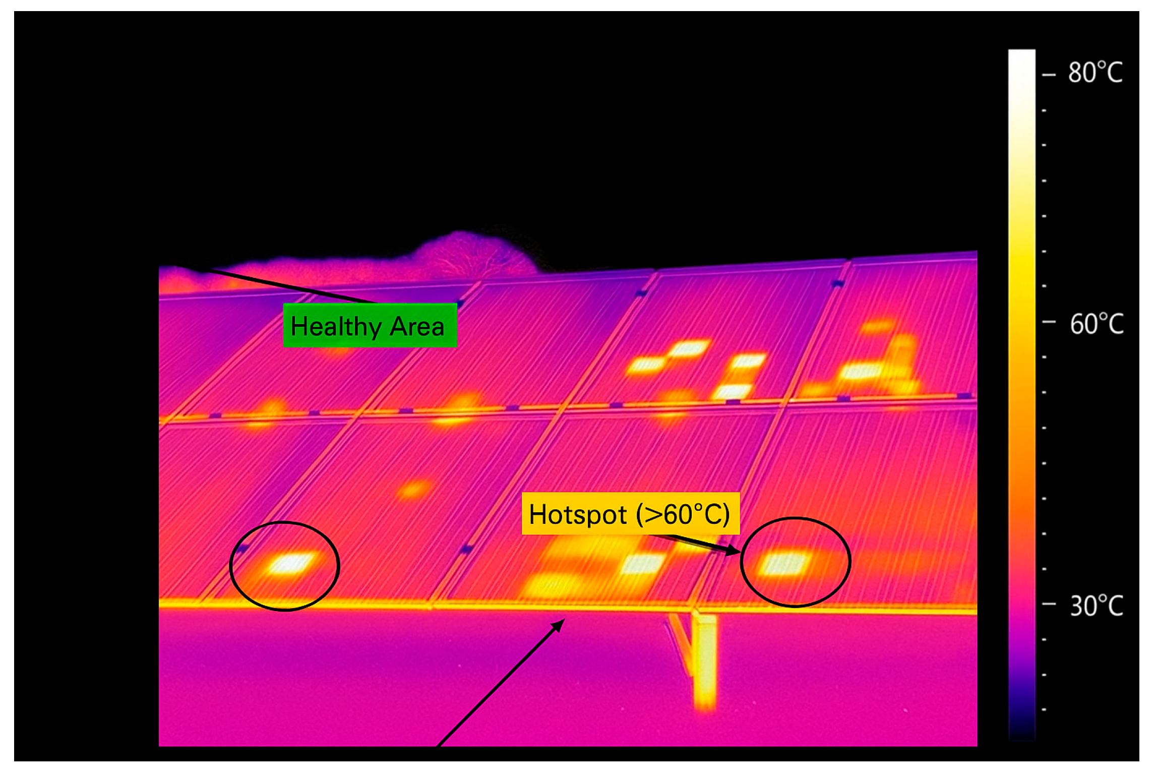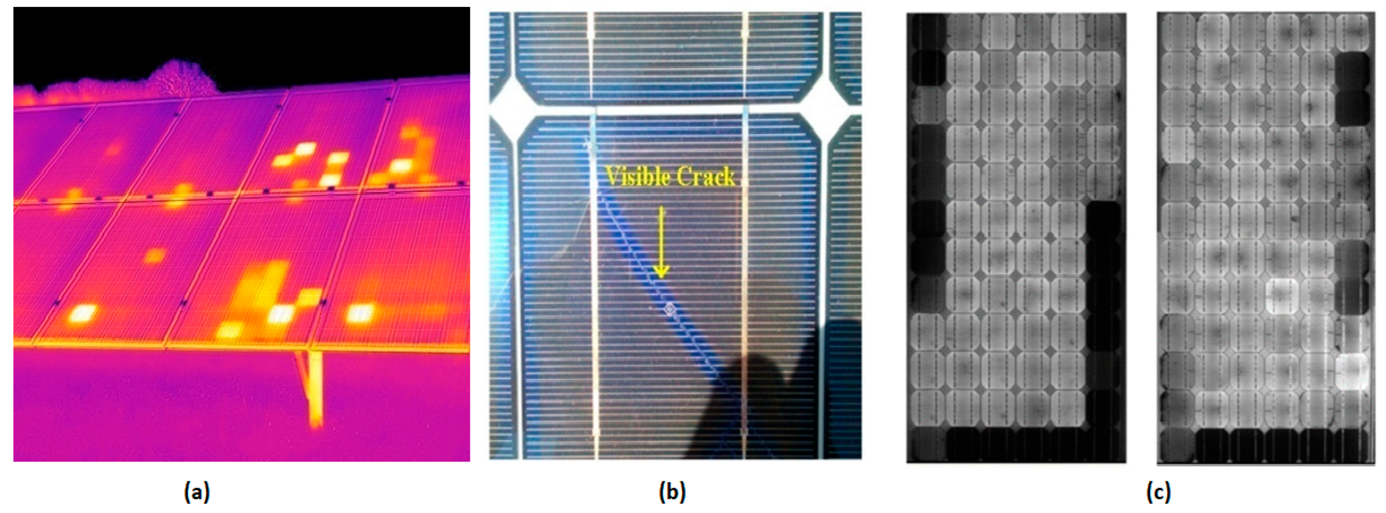 Hot spotsLocalized overheating in solar cellsShading, defective bypass diodes, and soldering defectsDecreased efficiency, potential fire hazard